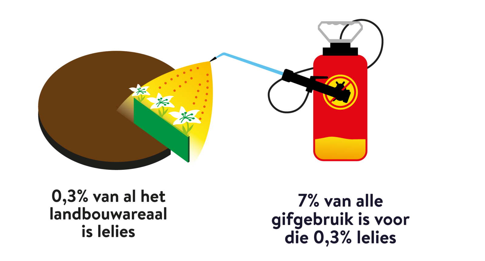 Binnen de landbouw is de lelieteelt de grootste gifgebruiker per hectare: goed voor 0,3% van het landbouwareaal, maar ook voor 12% van alle gifgebruik. Wekelijks gaat er een andere cocktail overheen om de bloemen en bollen schoon te houden voor de export.